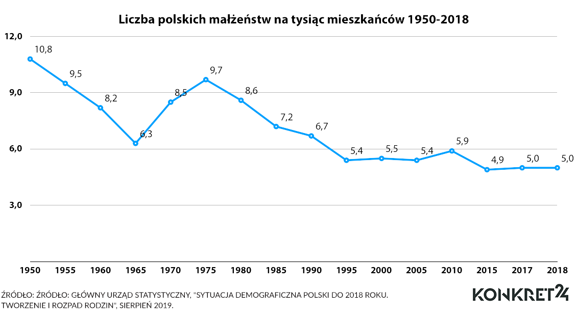 Ciekawym faktem jest, że w dłuższej perspektywie liczba małżeństw, nie tylko konkordatowych wyraźnie spada. Odsetek małżeństw przypadających na 1000 mieszkańców w czasach powojennych był dwukrotnie wyższy niż obecnie: