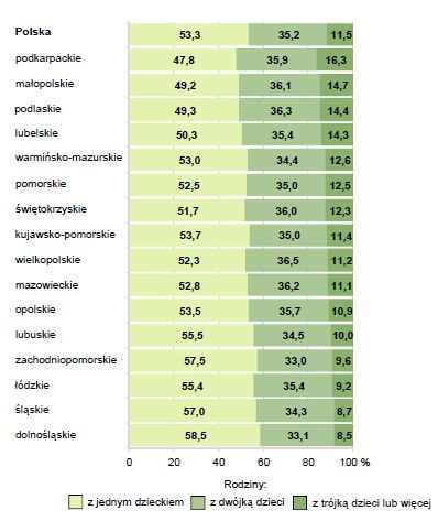Najwięcej rodzin wielodzietnych żyje w województwie podkarpackim (16,3) i małopolskim (14,7), natomiast najwięcej rodzin z jednym dzieckiem znajdziemy w dolnośląskim (58,5%), śląskim (57%) i łódzkim (55,5%). Jest ich jednak wyraźna mniejszość (8.5- 11.5%). Widzimy wyraźnie, że rodziny z jednym dzieckiem dominują wyraźnie właściwe bez względu na region Polski.[10]
