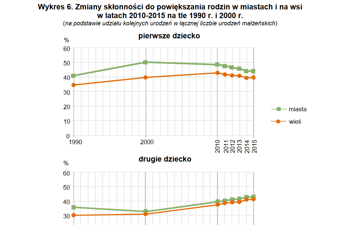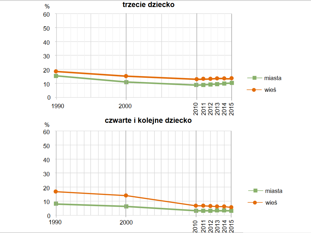 Ciekawie również rysuje się odpowiedź na pytanie jak kształtuje się dzietność w Polsce /liczba dzieci w rodzinach w Polsce w kategorii miasto/wieś. Widać wyraźnie, że w miastach więcej mamy rodzin z jednym i dwojgiem dzieci, natomiast w mniejszych ośrodkach- czyli np. na wsiach więcej jest rodzin wielodzietnych. Ciekawe będzie odkrycie, że zarówno w miastach jak i na wsiach rośnie liczba rodzin z dwojgiem dzieci, natomiast dzietność ogólna wykazuje tendencję spadkową.
