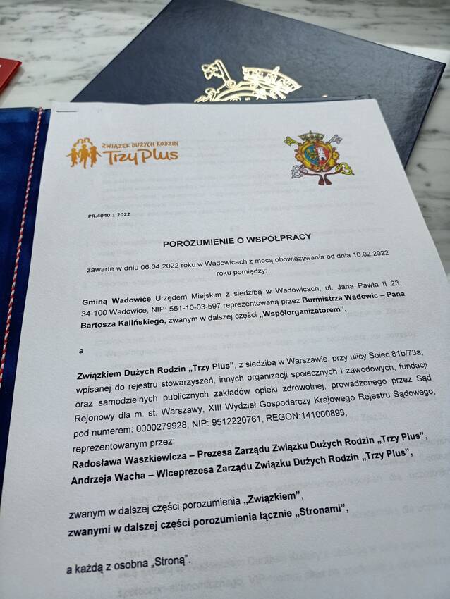 W środę 6 kwietnia br. podczas konferencji prasowej w Urzędzie Miejskim w Wadowicach zostało podpisane porozumienie między organizatorem - Związkiem Dużych Rodzin „Trzy Plus” a tegorocznym gospodarzem jubileuszowego Zjazdu Dużych Rodzin, czyli Gminą Wadowice. Podpisy pod dokumentem złożyli: Radosław Waszkiewicz i Andrzej Wach, kolejno prezes i wiceprezes Zarządu Związku Dużych Rodzin oraz Bartosz Kaliński Burmistrz Wadowic.